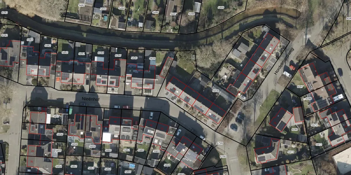 Het perceel waarop Nieënhof 8 staat heeft een oppervlakte van 2071 m². Dit is een zeer groot perceel. De perceeloppervlakte wordt geregistreerd door het Kadaster. Gedetailleerde informatie over de maten van dit perceel kunt u vinden in het rapport Kadastrale kaart met maatvoering van Nieënhof 8.