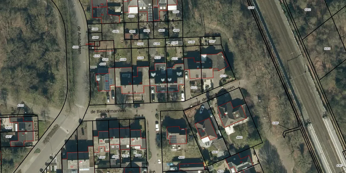 Het perceel waarop de Biestermannen 22 staat heeft een oppervlakte van 319 m². Dit is een groot perceel. De perceeloppervlakte wordt geregistreerd door het Kadaster. Gedetailleerde informatie over de maten van dit perceel kunt u vinden in het rapport Kadastrale kaart met maatvoering van de Biestermannen 22.