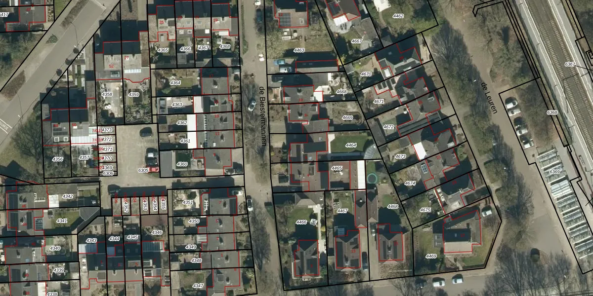Het perceel waarop de Biestermannen 6 staat heeft een oppervlakte van 360 m². Dit is een groot perceel. De perceeloppervlakte wordt geregistreerd door het Kadaster. Gedetailleerde informatie over de maten van dit perceel kunt u vinden in het rapport Kadastrale kaart met maatvoering van de Biestermannen 6.