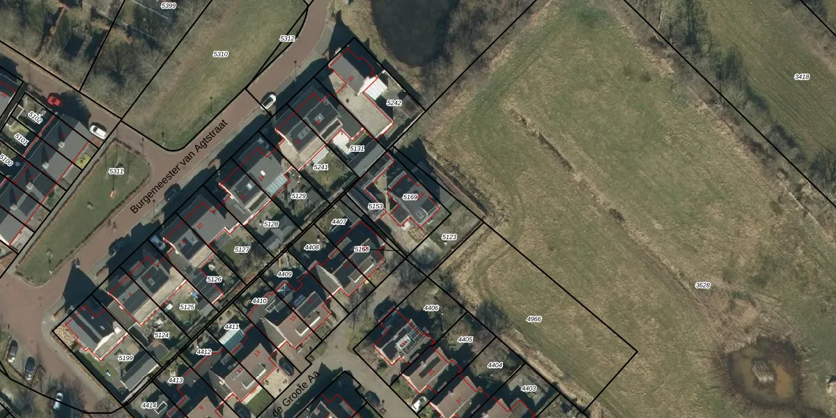 Het perceel waarop de Groote Aa 21-a staat heeft een oppervlakte van 315 m². Dit is een groot perceel. De perceeloppervlakte wordt geregistreerd door het Kadaster. Gedetailleerde informatie over de maten van dit perceel kunt u vinden in het rapport Kadastrale kaart met maatvoering van de Groote Aa 21-a.