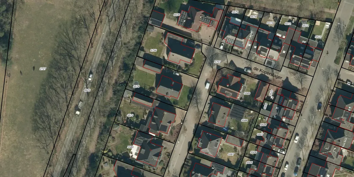 Het perceel waarop de Koperslager 15 staat heeft een oppervlakte van 724 m². Dit is een groot perceel. De perceeloppervlakte wordt geregistreerd door het Kadaster. Gedetailleerde informatie over de maten van dit perceel kunt u vinden in het rapport Kadastrale kaart met maatvoering van de Koperslager 15.