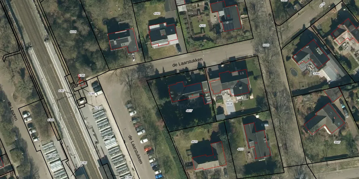 Het perceel waarop de Laarstukken 4 staat heeft een oppervlakte van 939 m². Dit is een groot perceel. De perceeloppervlakte wordt geregistreerd door het Kadaster. Gedetailleerde informatie over de maten van dit perceel kunt u vinden in het rapport Kadastrale kaart met maatvoering van de Laarstukken 4.