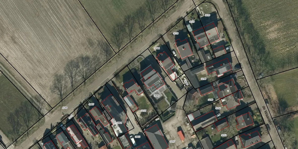 Het perceel waarop de Waarden 30 staat heeft een oppervlakte van 820 m². Dit is een groot perceel. De perceeloppervlakte wordt geregistreerd door het Kadaster. Gedetailleerde informatie over de maten van dit perceel kunt u vinden in het rapport Kadastrale kaart met maatvoering van de Waarden 30.