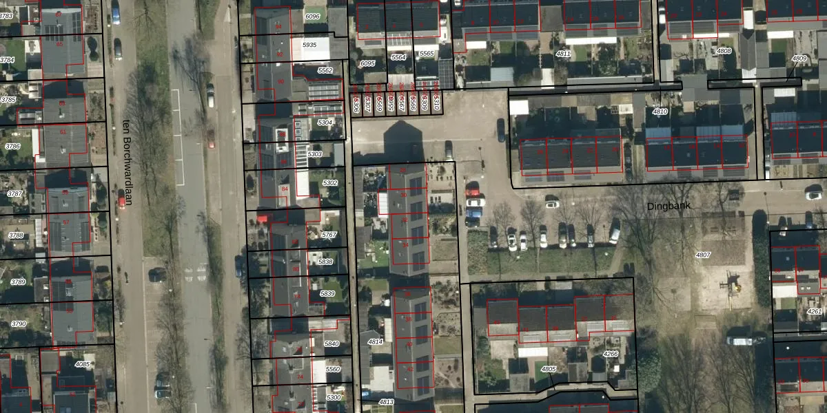 Het perceel waarop Dingbank 30 staat heeft een oppervlakte van 2295 m². Dit is een zeer groot perceel. De perceeloppervlakte wordt geregistreerd door het Kadaster. Gedetailleerde informatie over de maten van dit perceel kunt u vinden in het rapport Kadastrale kaart met maatvoering van Dingbank 30.