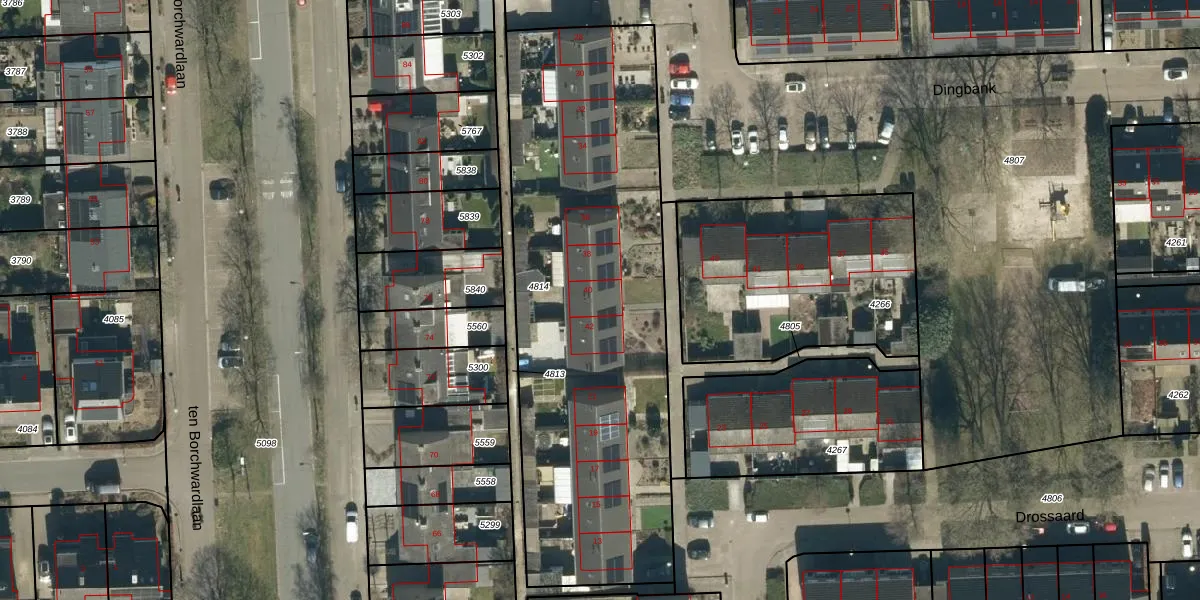 Het perceel waarop Dingbank 40 staat heeft een oppervlakte van 2295 m². Dit is een zeer groot perceel. De perceeloppervlakte wordt geregistreerd door het Kadaster. Gedetailleerde informatie over de maten van dit perceel kunt u vinden in het rapport Kadastrale kaart met maatvoering van Dingbank 40.