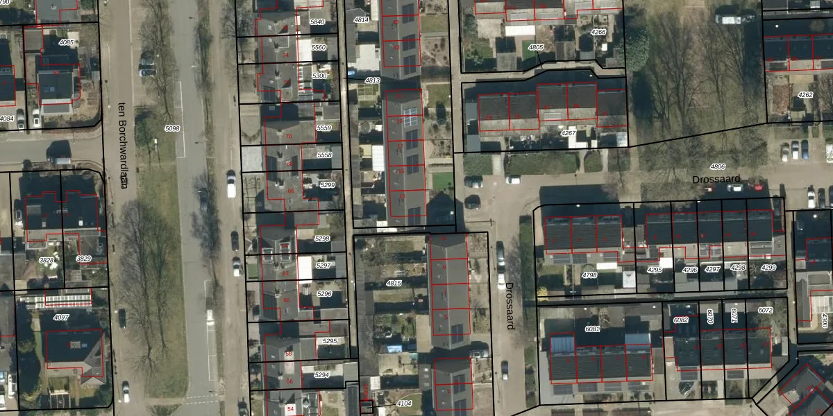 Het perceel waarop Drossaard 13 staat heeft een oppervlakte van 2295 m². Dit is een zeer groot perceel. De perceeloppervlakte wordt geregistreerd door het Kadaster. Gedetailleerde informatie over de maten van dit perceel kunt u vinden in het rapport Kadastrale kaart met maatvoering van Drossaard 13.