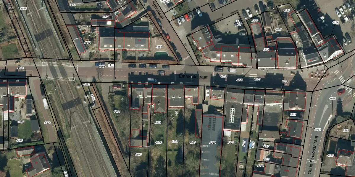 Het perceel waarop Emmerikstraat 15 staat heeft een oppervlakte van 605 m². Dit is een groot perceel. De perceeloppervlakte wordt geregistreerd door het Kadaster. Gedetailleerde informatie over de maten van dit perceel kunt u vinden in het rapport Kadastrale kaart met maatvoering van Emmerikstraat 15.