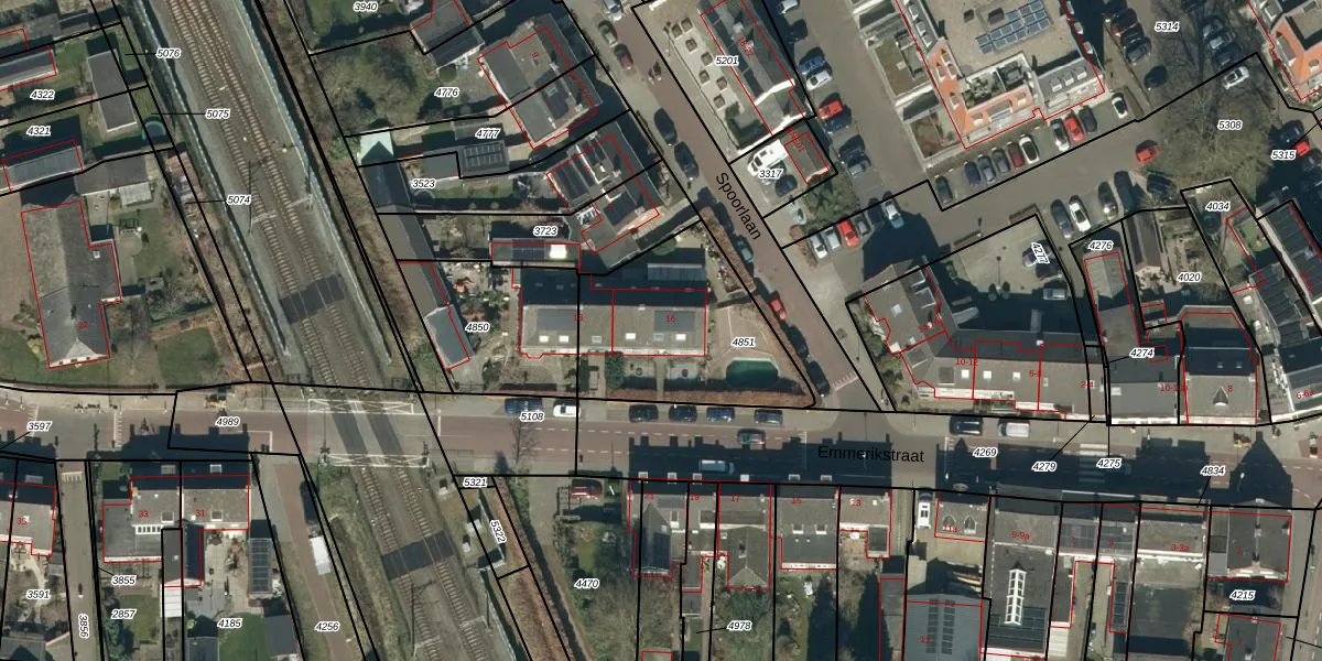Het perceel waarop Emmerikstraat 16 staat heeft een oppervlakte van 676 m². Dit is een groot perceel. De perceeloppervlakte wordt geregistreerd door het Kadaster. Gedetailleerde informatie over de maten van dit perceel kunt u vinden in het rapport Kadastrale kaart met maatvoering van Emmerikstraat 16.