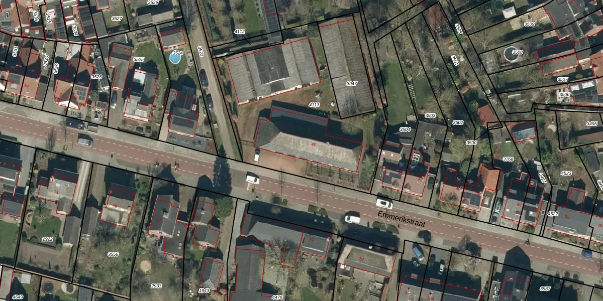 Het perceel waarop Emmerikstraat 46 staat heeft een oppervlakte van 1968 m². Dit is een zeer groot perceel. De perceeloppervlakte wordt geregistreerd door het Kadaster. Gedetailleerde informatie over de maten van dit perceel kunt u vinden in het rapport Kadastrale kaart met maatvoering van Emmerikstraat 46.