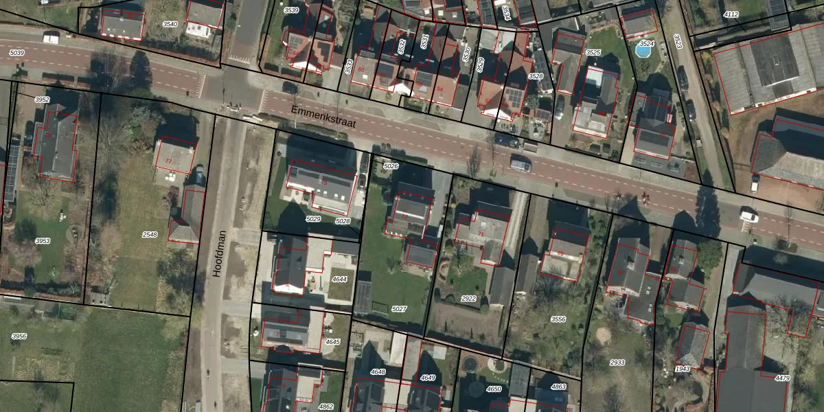 Het perceel waarop Emmerikstraat 73 staat heeft een oppervlakte van 761 m². Dit is een groot perceel. De perceeloppervlakte wordt geregistreerd door het Kadaster. Gedetailleerde informatie over de maten van dit perceel kunt u vinden in het rapport Kadastrale kaart met maatvoering van Emmerikstraat 73.