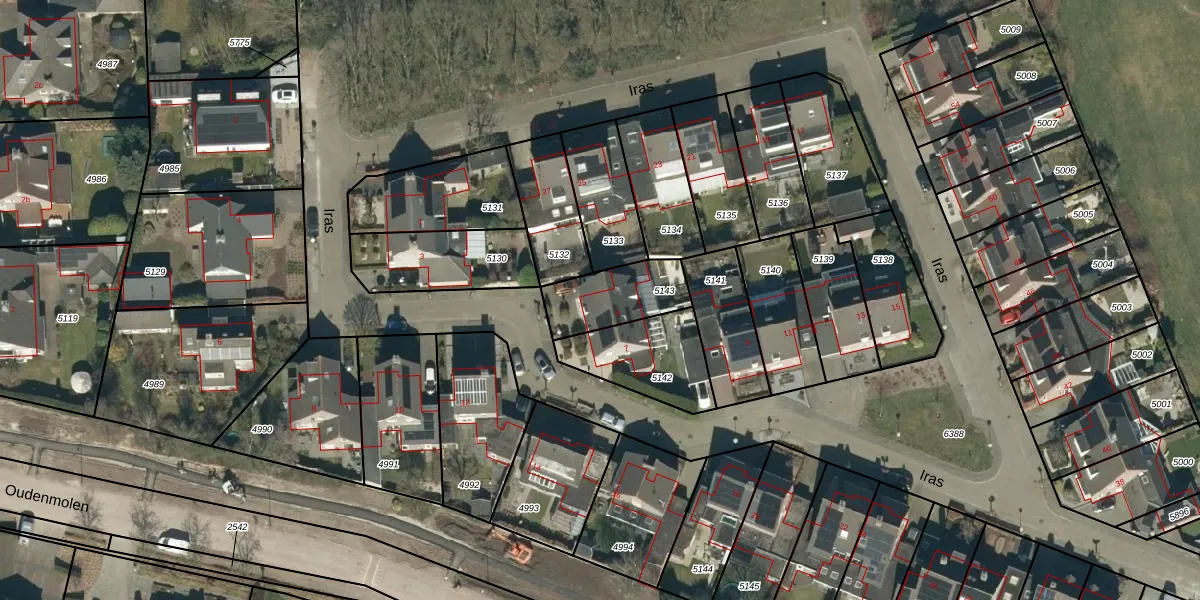 Het perceel waarop Iras 5 staat heeft een oppervlakte van 222 m². Dit is een middelgroot perceel. De perceeloppervlakte wordt geregistreerd door het Kadaster. Gedetailleerde informatie over de maten van dit perceel kunt u vinden in het rapport Kadastrale kaart met maatvoering van Iras 5.