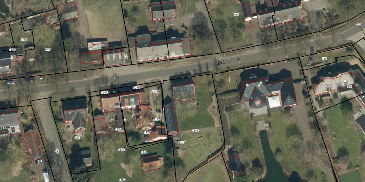 Het perceel waarop Rul 15 staat heeft een oppervlakte van 1482 m². Dit is een zeer groot perceel. De perceeloppervlakte wordt geregistreerd door het Kadaster. Gedetailleerde informatie over de maten van dit perceel kunt u vinden in het rapport Kadastrale kaart met maatvoering van Rul 15.