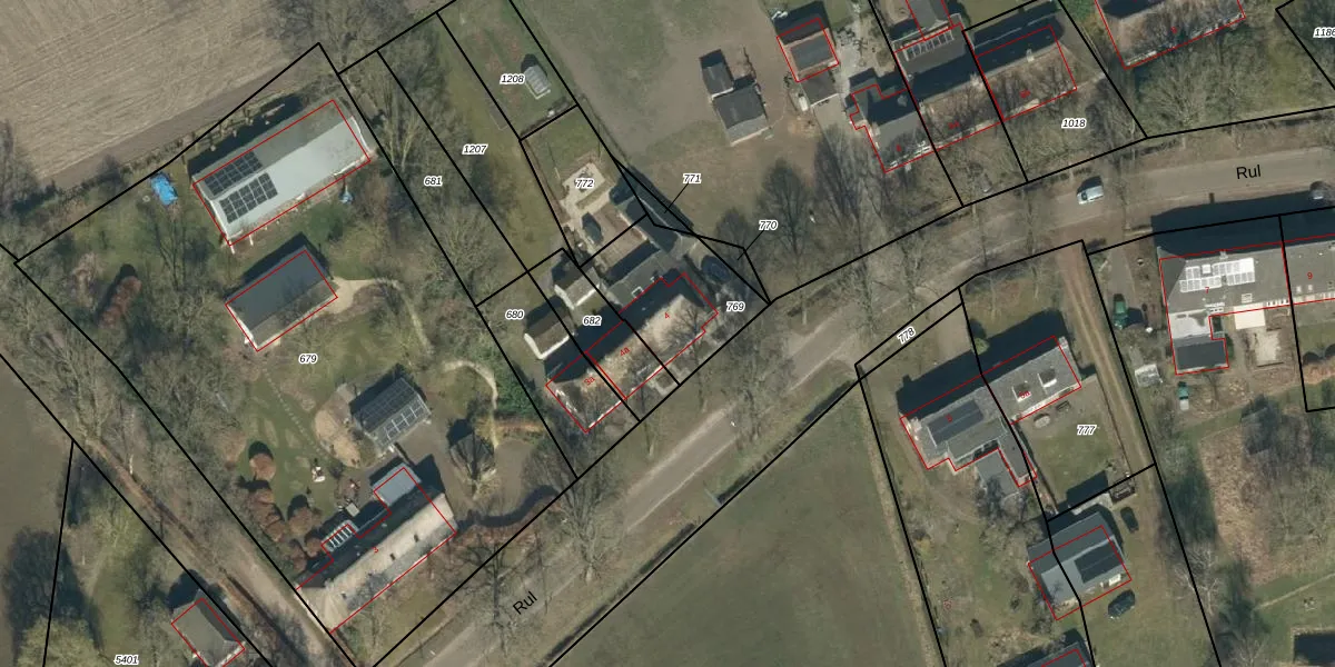 Het perceel waarop Rul 4 staat heeft een oppervlakte van 351 m². Dit is een groot perceel. De perceeloppervlakte wordt geregistreerd door het Kadaster. Gedetailleerde informatie over de maten van dit perceel kunt u vinden in het rapport Kadastrale kaart met maatvoering van Rul 4.