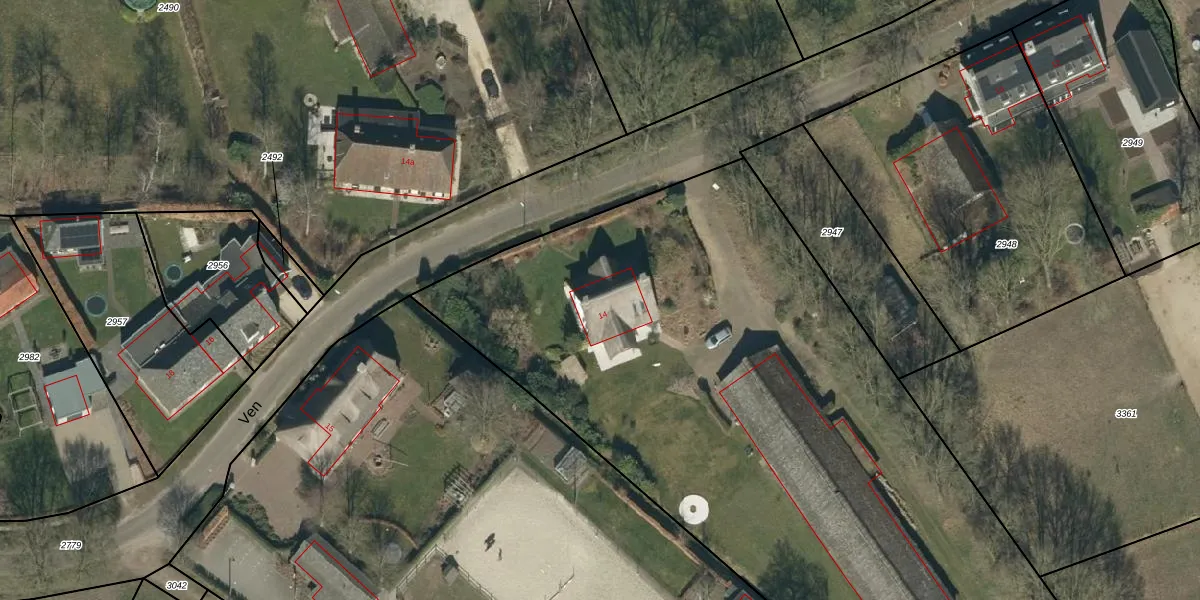 Het perceel waarop Ven 14 staat heeft een oppervlakte van 2,5 ha. Dit is een zeer groot perceel. De perceeloppervlakte wordt geregistreerd door het Kadaster. Gedetailleerde informatie over de maten van dit perceel kunt u vinden in het rapport Kadastrale kaart met maatvoering van Ven 14.