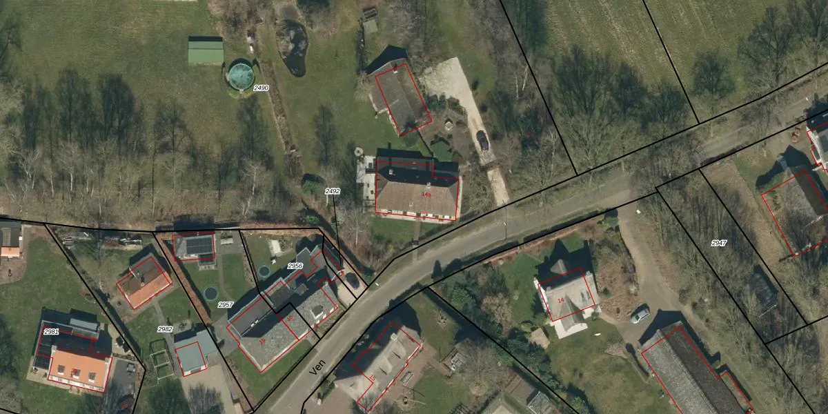 Het perceel waarop Ven 14-a staat heeft een oppervlakte van 1,0 ha. Dit is een zeer groot perceel. De perceeloppervlakte wordt geregistreerd door het Kadaster. Gedetailleerde informatie over de maten van dit perceel kunt u vinden in het rapport Kadastrale kaart met maatvoering van Ven 14-a.