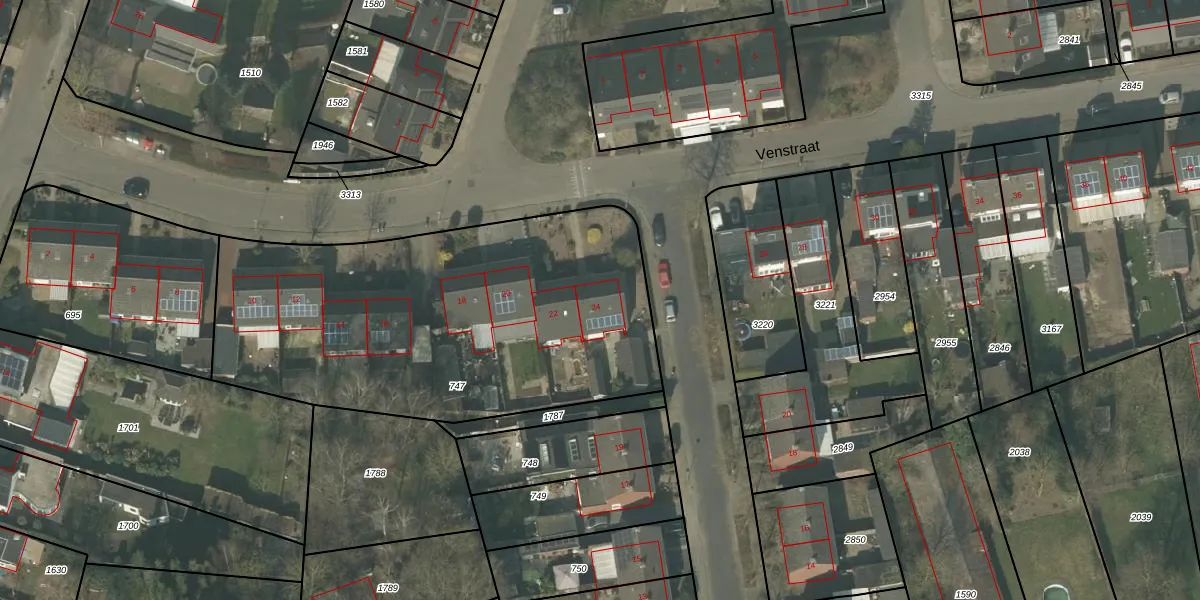 Het perceel waarop Venstraat 24 staat heeft een oppervlakte van 2150 m². Dit is een zeer groot perceel. De perceeloppervlakte wordt geregistreerd door het Kadaster. Gedetailleerde informatie over de maten van dit perceel kunt u vinden in het rapport Kadastrale kaart met maatvoering van Venstraat 24.