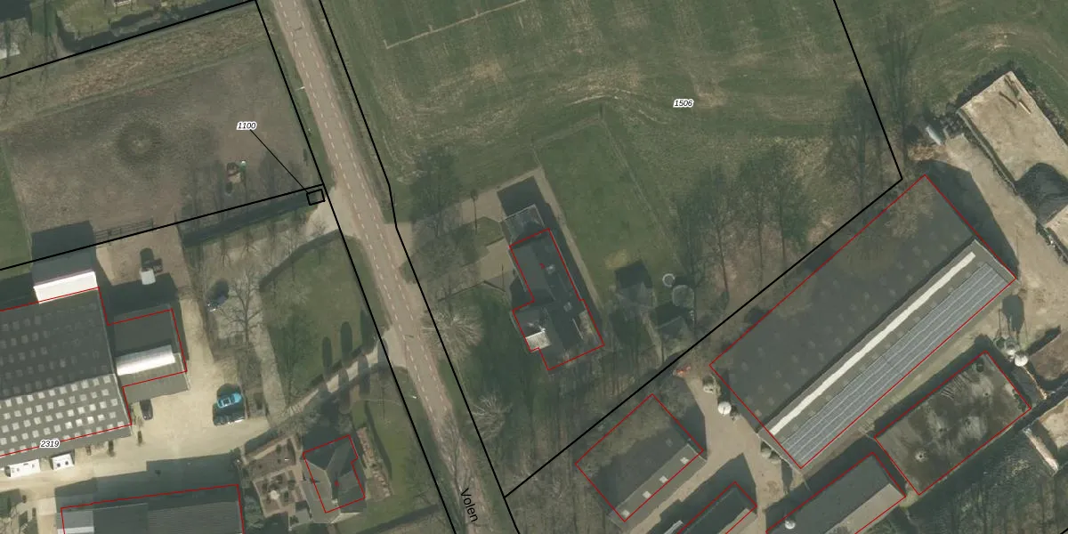 Het perceel waarop Volen 3 staat heeft een oppervlakte van 1,1 ha. Dit is een zeer groot perceel. De perceeloppervlakte wordt geregistreerd door het Kadaster. Gedetailleerde informatie over de maten van dit perceel kunt u vinden in het rapport Kadastrale kaart met maatvoering van Volen 3.