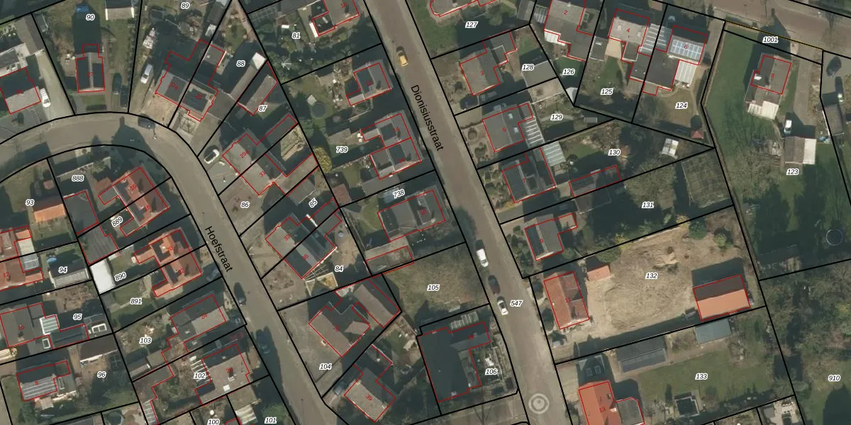 Het perceel waarop Dionisiusstraat 18 staat heeft een oppervlakte van 433 m². Dit is een groot perceel. De perceeloppervlakte wordt geregistreerd door het Kadaster. Gedetailleerde informatie over de maten van dit perceel kunt u vinden in het rapport Kadastrale kaart met maatvoering van Dionisiusstraat 18.