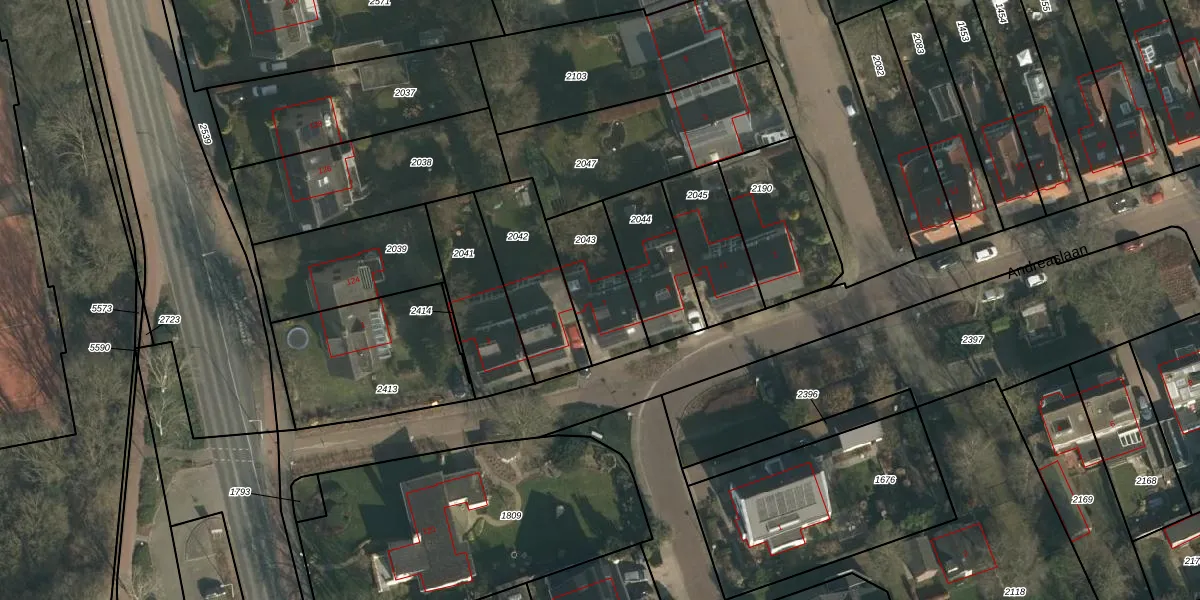 Andreaslaan 7 is gelegen op kadastraal perceel GBK00H2043. Deze kadastrale aanduiding is uniek en wordt gebruikt door het Kadaster om eigendomsrechten en andere zakelijke rechten vast te leggen. Het perceel maakt onderdeel uit van de kadastrale gemeente Groesbeek.