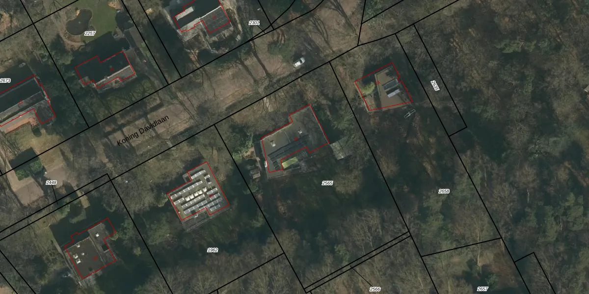 Het perceel waarop Koning Davidlaan 22 staat heeft een oppervlakte van 2725 m². Dit is een zeer groot perceel. De perceeloppervlakte wordt geregistreerd door het Kadaster. Gedetailleerde informatie over de maten van dit perceel kunt u vinden in het rapport Kadastrale kaart met maatvoering van Koning Davidlaan 22.