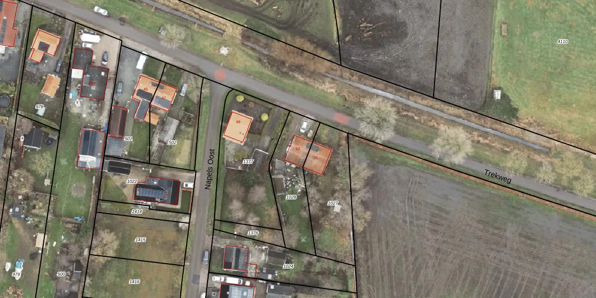 Trekweg 53 is gelegen op kadastraal perceel SDA00I1028. Deze kadastrale aanduiding is uniek en wordt gebruikt door het Kadaster om eigendomsrechten en andere zakelijke rechten vast te leggen. Het perceel maakt onderdeel uit van de kadastrale gemeente Scheemda.