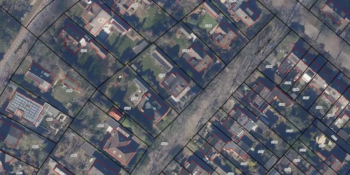 Het perceel waarop Baafjeslaan 10 staat heeft een oppervlakte van 775 m². Dit is een groot perceel. De perceeloppervlakte wordt geregistreerd door het Kadaster. Gedetailleerde informatie over de maten van dit perceel kunt u vinden in het rapport Kadastrale kaart met maatvoering van Baafjeslaan 10.