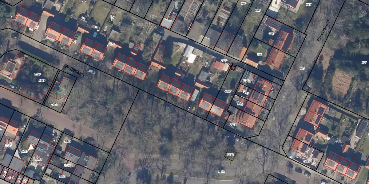Het perceel waarop Butterlaan 45 staat heeft een oppervlakte van 4782 m². Dit is een zeer groot perceel. De perceeloppervlakte wordt geregistreerd door het Kadaster. Gedetailleerde informatie over de maten van dit perceel kunt u vinden in het rapport Kadastrale kaart met maatvoering van Butterlaan 45.