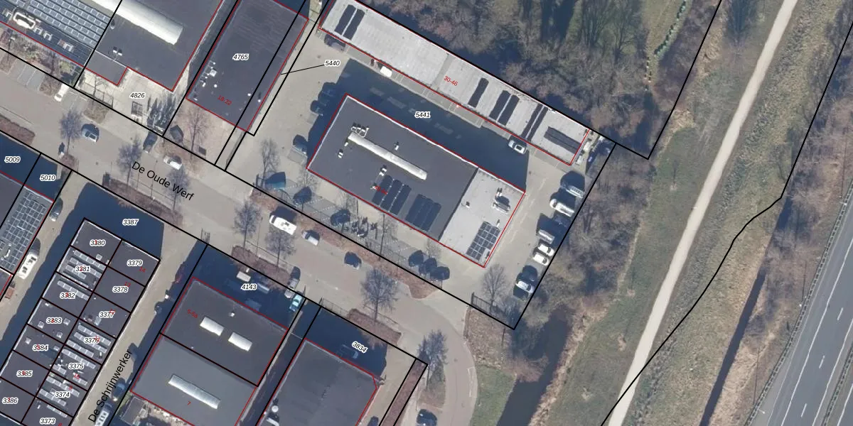 Het perceel waarop De Oude Werf 60 staat heeft een oppervlakte van 3780 m². Dit is een zeer groot perceel. De perceeloppervlakte wordt geregistreerd door het Kadaster. Gedetailleerde informatie over de maten van dit perceel kunt u vinden in het rapport Kadastrale kaart met maatvoering van De Oude Werf 60.