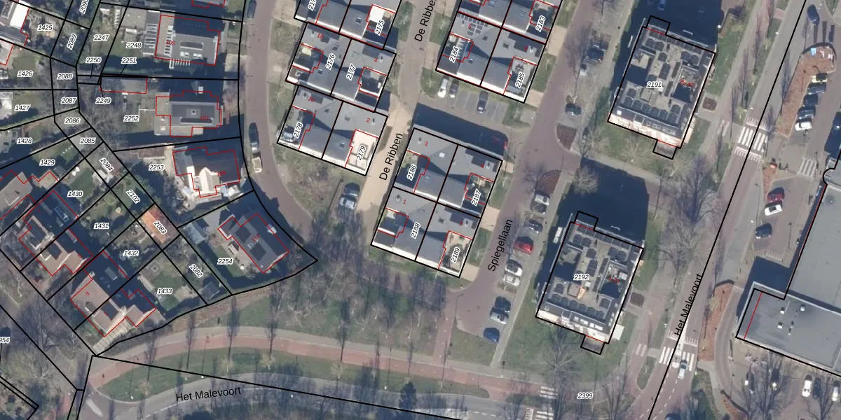 De Ribben 1 is gelegen op kadastraal perceel HLO00F2188. Deze kadastrale aanduiding is uniek en wordt gebruikt door het Kadaster om eigendomsrechten en andere zakelijke rechten vast te leggen. Het perceel maakt onderdeel uit van de kadastrale gemeente Heiloo.
