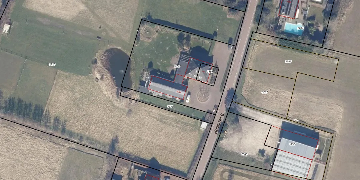 Het perceel waarop Hoogeweg 47-a staat heeft een oppervlakte van 2048 m². Dit is een zeer groot perceel. De perceeloppervlakte wordt geregistreerd door het Kadaster. Gedetailleerde informatie over de maten van dit perceel kunt u vinden in het rapport Kadastrale kaart met maatvoering van Hoogeweg 47-a.