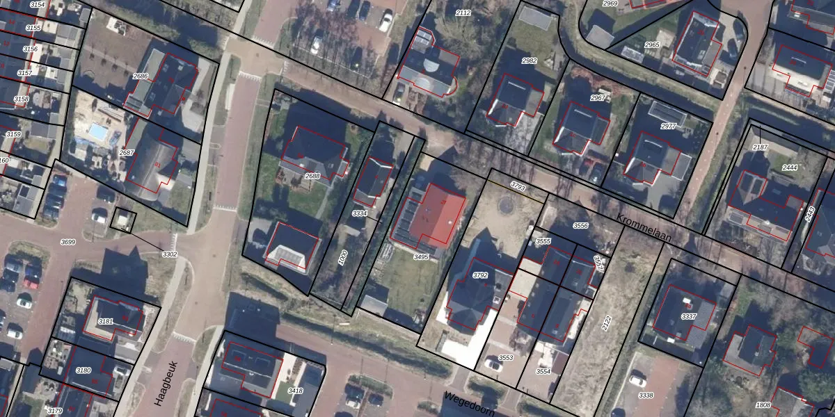 Het perceel waarop Krommelaan 2-f staat heeft een oppervlakte van 694 m². Dit is een groot perceel. De perceeloppervlakte wordt geregistreerd door het Kadaster. Gedetailleerde informatie over de maten van dit perceel kunt u vinden in het rapport Kadastrale kaart met maatvoering van Krommelaan 2-f.