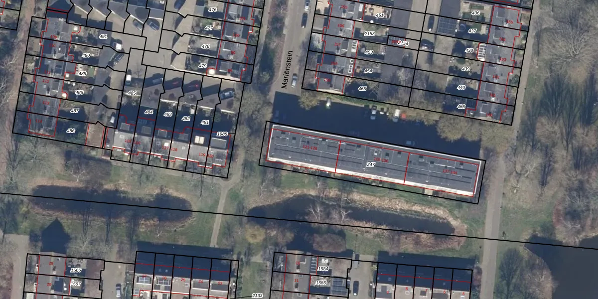 Het perceel waarop Mariënstein 124 staat heeft een oppervlakte van 1104 m². Dit is een zeer groot perceel. De perceeloppervlakte wordt geregistreerd door het Kadaster. Gedetailleerde informatie over de maten van dit perceel kunt u vinden in het rapport Kadastrale kaart met maatvoering van Mariënstein 124.