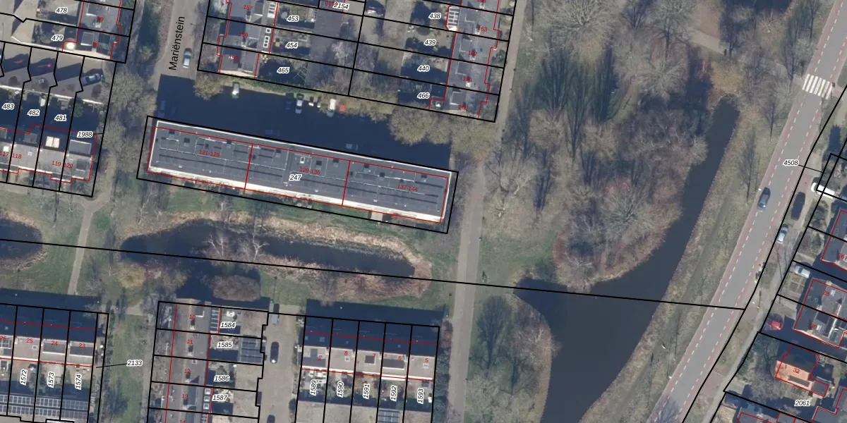 Het perceel waarop Mariënstein 144 staat heeft een oppervlakte van 1104 m². Dit is een zeer groot perceel. De perceeloppervlakte wordt geregistreerd door het Kadaster. Gedetailleerde informatie over de maten van dit perceel kunt u vinden in het rapport Kadastrale kaart met maatvoering van Mariënstein 144.