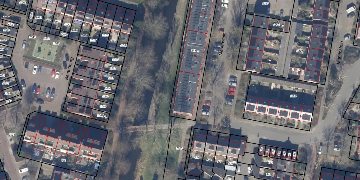Het perceel waarop Mariënstein 74 staat heeft een oppervlakte van 1105 m². Dit is een zeer groot perceel. De perceeloppervlakte wordt geregistreerd door het Kadaster. Gedetailleerde informatie over de maten van dit perceel kunt u vinden in het rapport Kadastrale kaart met maatvoering van Mariënstein 74.