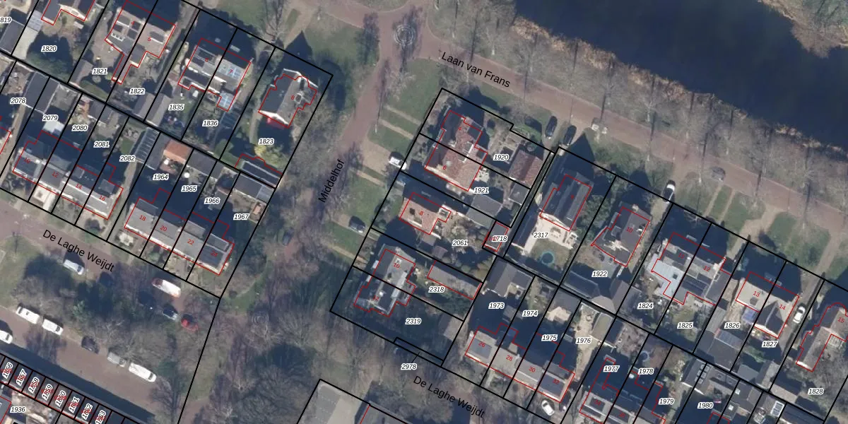 Het perceel waarop Middelhof 8 staat heeft een oppervlakte van 408 m². Dit is een groot perceel. De perceeloppervlakte wordt geregistreerd door het Kadaster. Gedetailleerde informatie over de maten van dit perceel kunt u vinden in het rapport Kadastrale kaart met maatvoering van Middelhof 8.