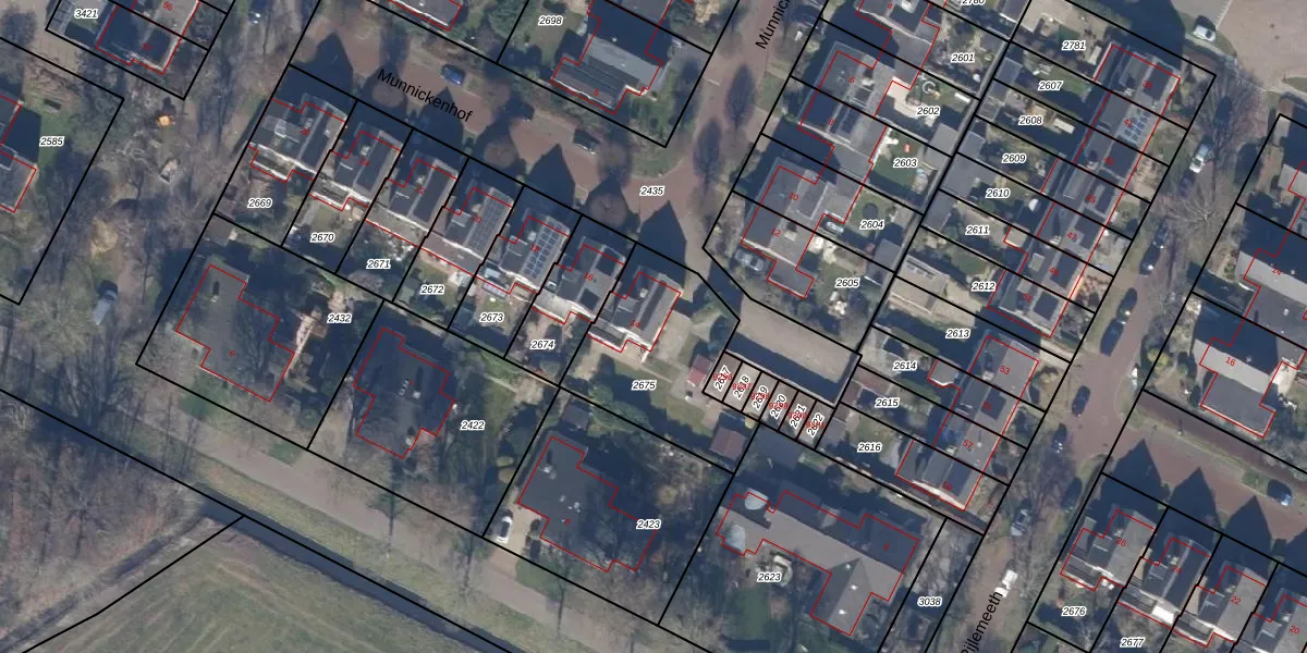 Het perceel waarop Munnickenhof 14 staat heeft een oppervlakte van 566 m². Dit is een groot perceel. De perceeloppervlakte wordt geregistreerd door het Kadaster. Gedetailleerde informatie over de maten van dit perceel kunt u vinden in het rapport Kadastrale kaart met maatvoering van Munnickenhof 14.