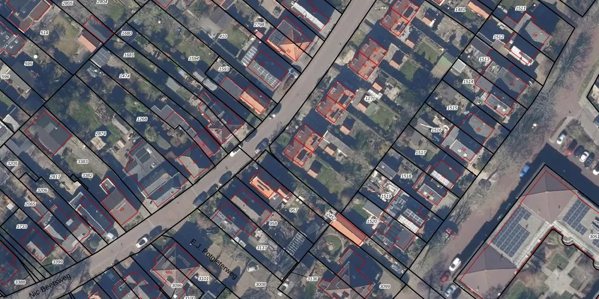 Het perceel waarop Nic Beetsweg 42 staat heeft een oppervlakte van 2390 m². Dit is een zeer groot perceel. De perceeloppervlakte wordt geregistreerd door het Kadaster. Gedetailleerde informatie over de maten van dit perceel kunt u vinden in het rapport Kadastrale kaart met maatvoering van Nic Beetsweg 42.