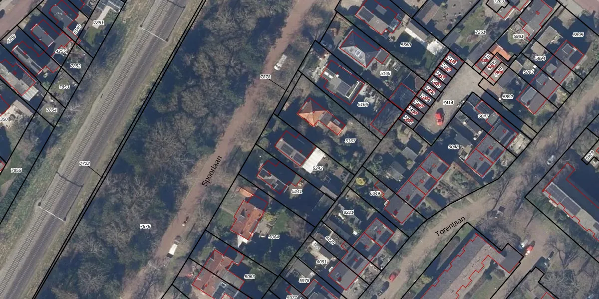 Het perceel waarop Spoorlaan 5 staat heeft een oppervlakte van 382 m². Dit is een groot perceel. De perceeloppervlakte wordt geregistreerd door het Kadaster. Gedetailleerde informatie over de maten van dit perceel kunt u vinden in het rapport Kadastrale kaart met maatvoering van Spoorlaan 5.