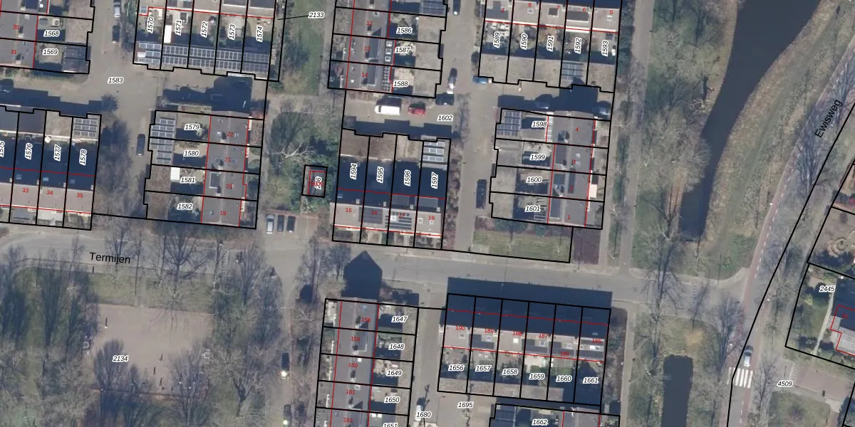 Het perceel waarop Termijen 18 staat heeft een oppervlakte van 166 m². Dit is een middelgroot perceel. De perceeloppervlakte wordt geregistreerd door het Kadaster. Gedetailleerde informatie over de maten van dit perceel kunt u vinden in het rapport Kadastrale kaart met maatvoering van Termijen 18.
