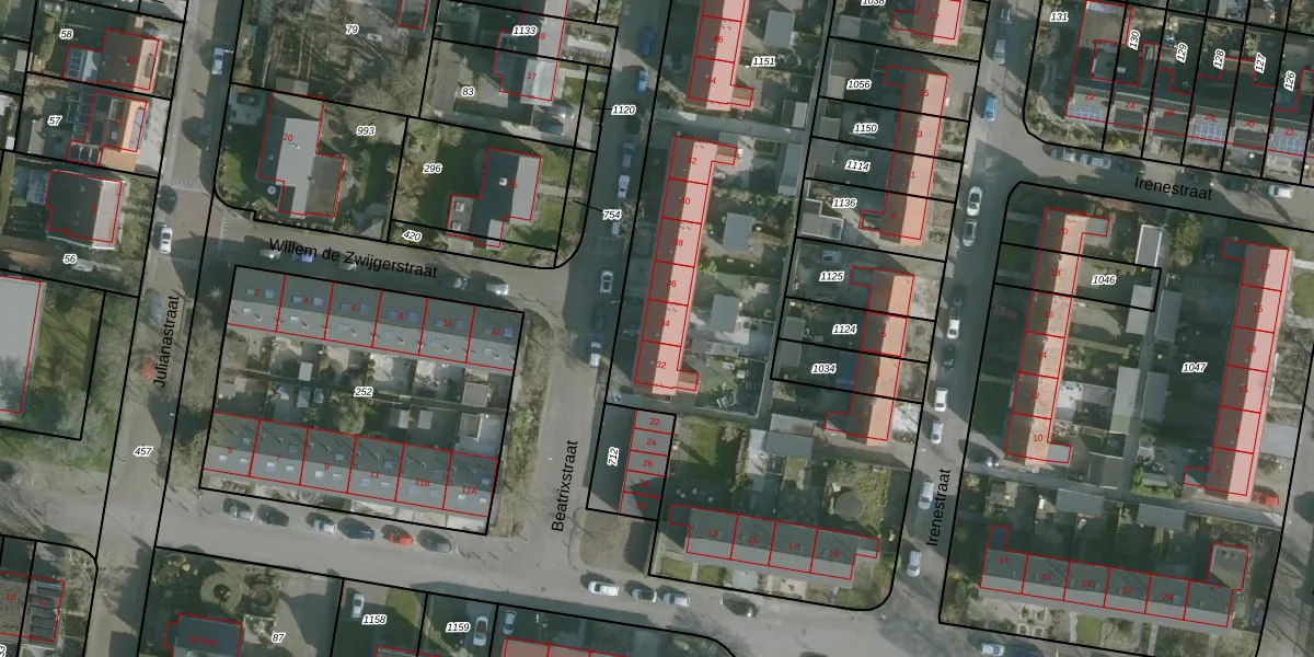Het perceel waarop Beatrixstraat 34 staat heeft een oppervlakte van 4514 m². Dit is een zeer groot perceel. De perceeloppervlakte wordt geregistreerd door het Kadaster. Gedetailleerde informatie over de maten van dit perceel kunt u vinden in het rapport Kadastrale kaart met maatvoering van Beatrixstraat 34.