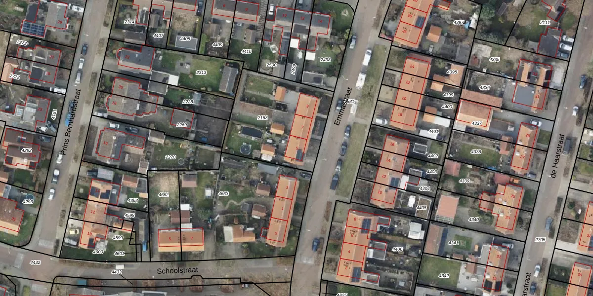 Het perceel waarop Emmastraat 5 staat heeft een oppervlakte van 915 m². Dit is een groot perceel. De perceeloppervlakte wordt geregistreerd door het Kadaster. Gedetailleerde informatie over de maten van dit perceel kunt u vinden in het rapport Kadastrale kaart met maatvoering van Emmastraat 5.
