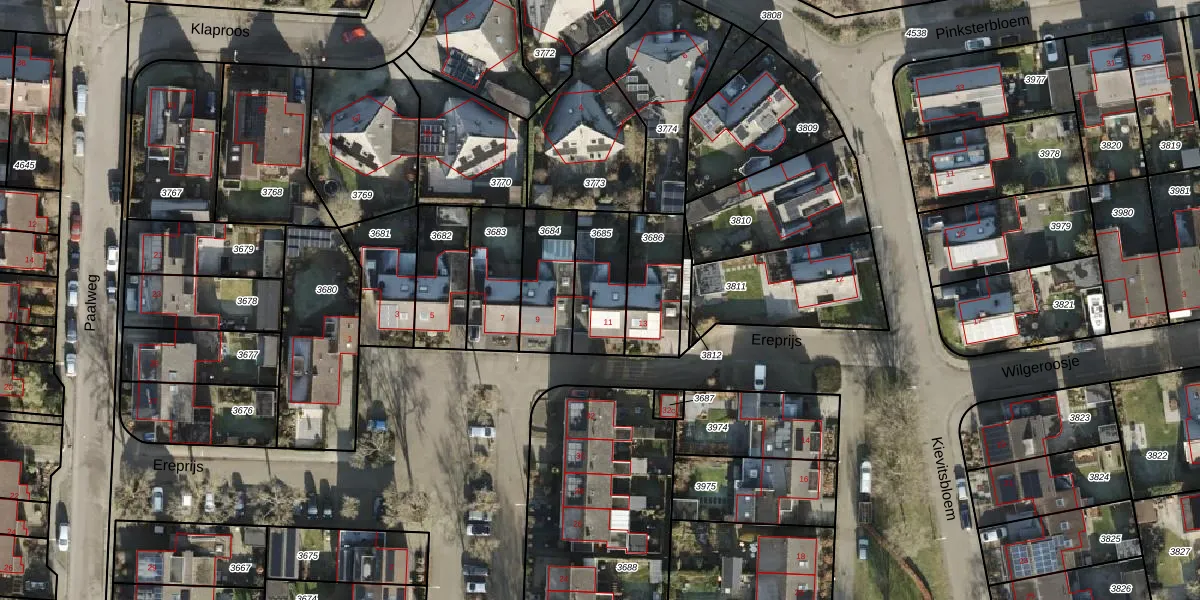 Gebruik de zoekbalk of klik op een perceel voor informatie over de adressen binnen dit perceel.