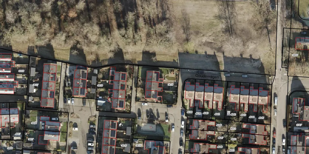 Het perceel waarop Goudenregen 42 staat heeft een oppervlakte van 619 m². Dit is een groot perceel. De perceeloppervlakte wordt geregistreerd door het Kadaster. Gedetailleerde informatie over de maten van dit perceel kunt u vinden in het rapport Kadastrale kaart met maatvoering van Goudenregen 42.