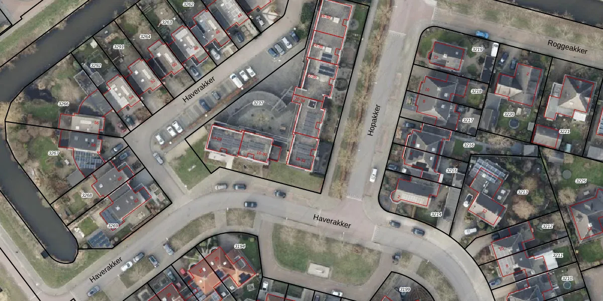 Het perceel waarop Haverakker 32 staat heeft een oppervlakte van 1875 m². Dit is een zeer groot perceel. De perceeloppervlakte wordt geregistreerd door het Kadaster. Gedetailleerde informatie over de maten van dit perceel kunt u vinden in het rapport Kadastrale kaart met maatvoering van Haverakker 32.