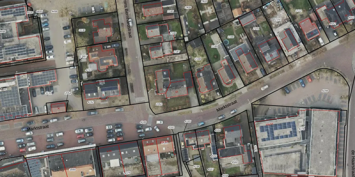 Het perceel waarop Marktstraat 13 staat heeft een oppervlakte van 723 m². Dit is een groot perceel. De perceeloppervlakte wordt geregistreerd door het Kadaster. Gedetailleerde informatie over de maten van dit perceel kunt u vinden in het rapport Kadastrale kaart met maatvoering van Marktstraat 13.