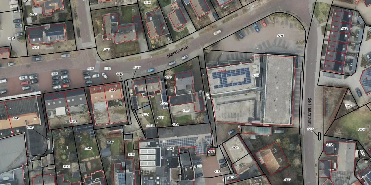 Het perceel waarop Marktstraat 16 staat heeft een oppervlakte van 654 m². Dit is een groot perceel. De perceeloppervlakte wordt geregistreerd door het Kadaster. Gedetailleerde informatie over de maten van dit perceel kunt u vinden in het rapport Kadastrale kaart met maatvoering van Marktstraat 16.
