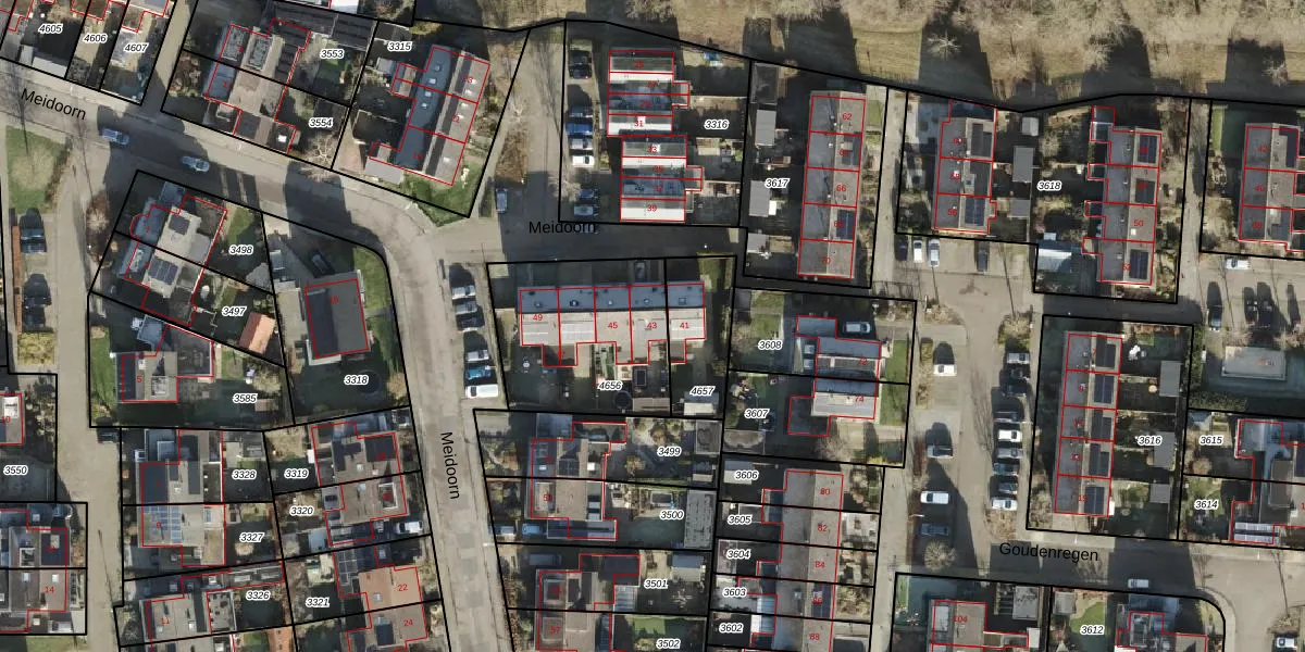 Het perceel waarop Meidoorn 43 staat heeft een oppervlakte van 616 m². Dit is een groot perceel. De perceeloppervlakte wordt geregistreerd door het Kadaster. Gedetailleerde informatie over de maten van dit perceel kunt u vinden in het rapport Kadastrale kaart met maatvoering van Meidoorn 43.