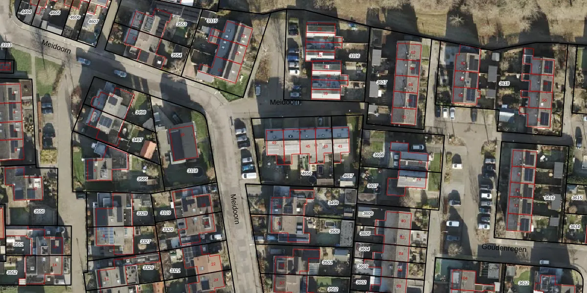 Het perceel waarop Meidoorn 47 staat heeft een oppervlakte van 616 m². Dit is een groot perceel. De perceeloppervlakte wordt geregistreerd door het Kadaster. Gedetailleerde informatie over de maten van dit perceel kunt u vinden in het rapport Kadastrale kaart met maatvoering van Meidoorn 47.