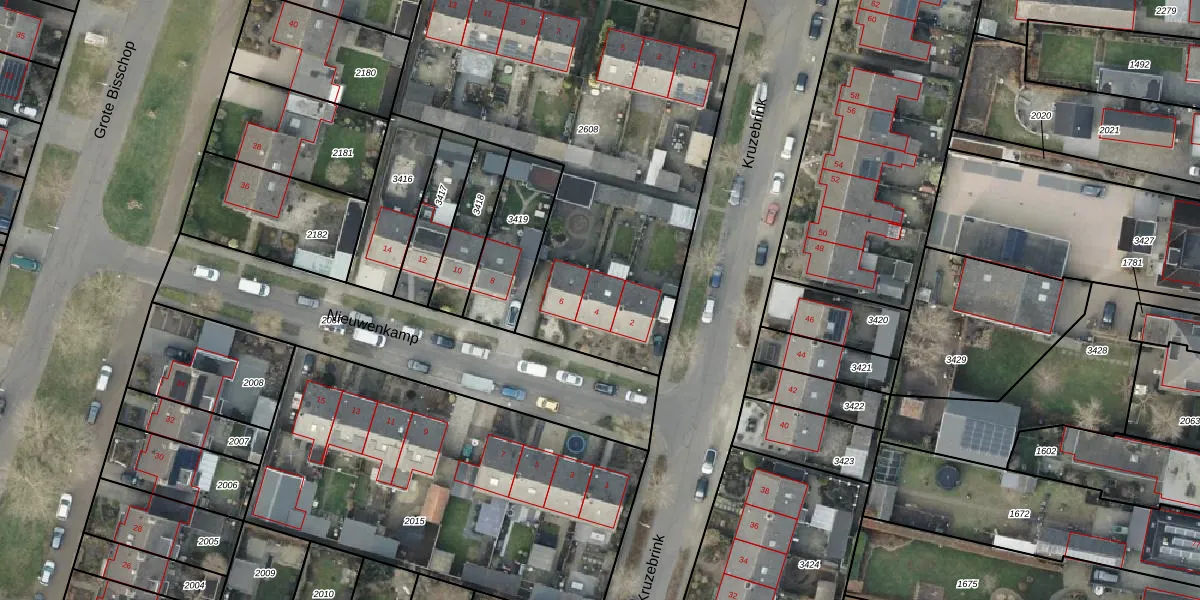 Het perceel waarop Nieuwenkamp 4 staat heeft een oppervlakte van 2243 m². Dit is een zeer groot perceel. De perceeloppervlakte wordt geregistreerd door het Kadaster. Gedetailleerde informatie over de maten van dit perceel kunt u vinden in het rapport Kadastrale kaart met maatvoering van Nieuwenkamp 4.
