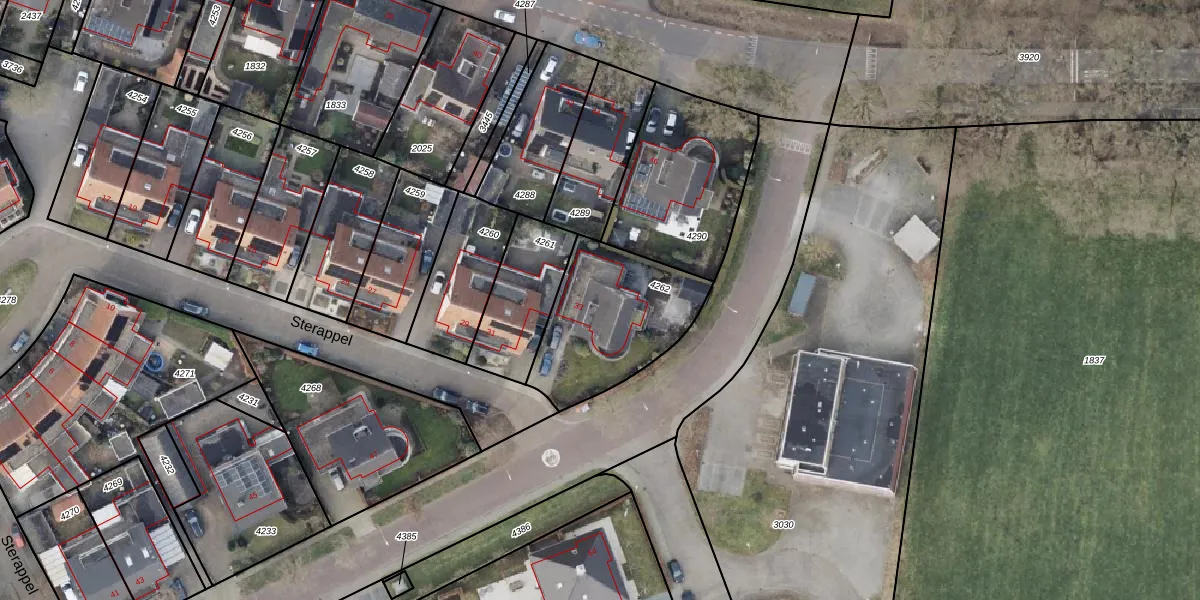 Het perceel waarop Sterappel 33 staat heeft een oppervlakte van 518 m². Dit is een groot perceel. De perceeloppervlakte wordt geregistreerd door het Kadaster. Gedetailleerde informatie over de maten van dit perceel kunt u vinden in het rapport Kadastrale kaart met maatvoering van Sterappel 33.